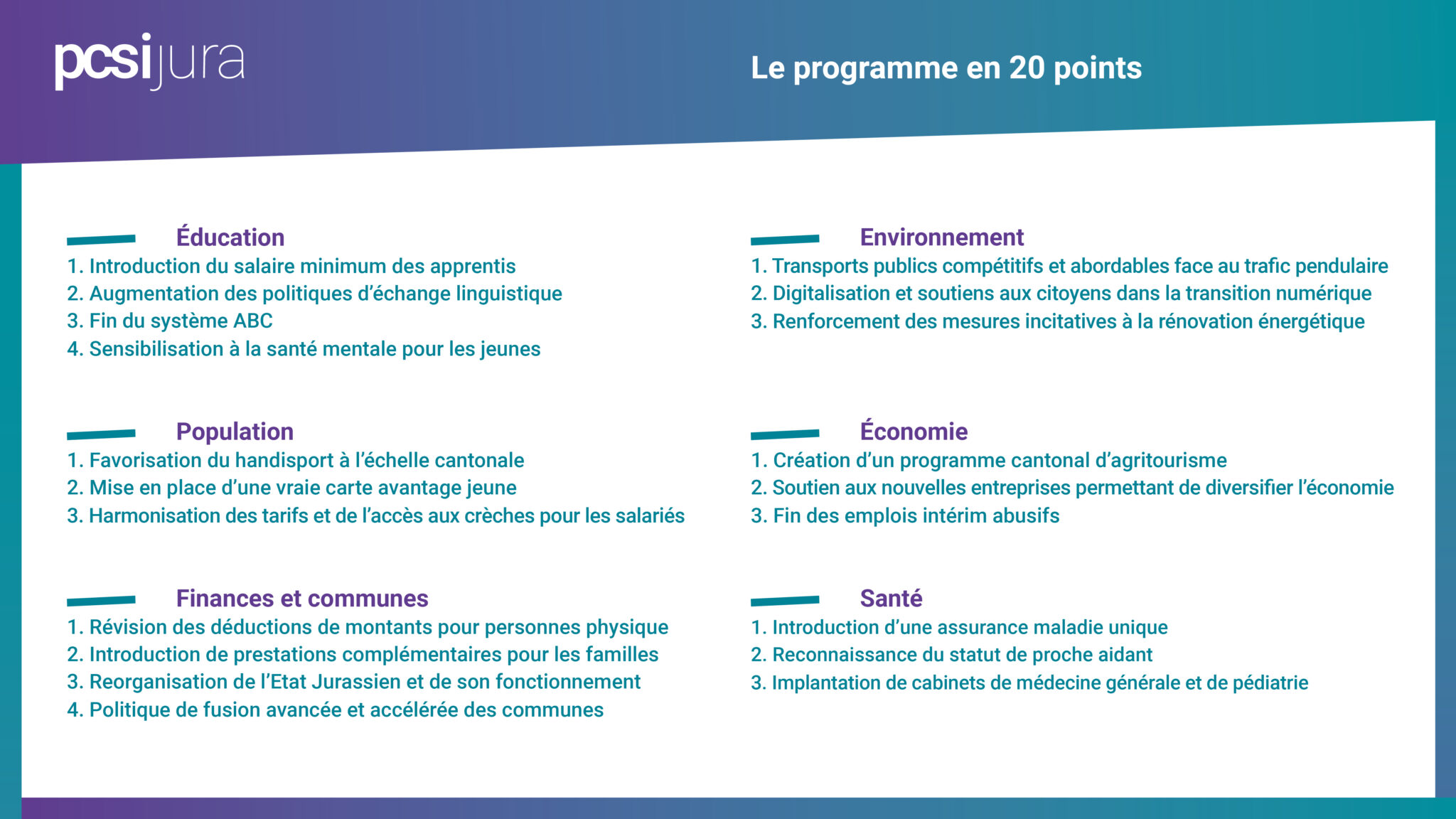 Depuis sa création et pour longtemps encore, le PCSI se bat pour un Jura où égalité rime avec équité, où la valeur du travail est reconnue et où la justice est impartiale. En bref, un Jura où l’indépendance est notre force pour bâtir l’avenir.